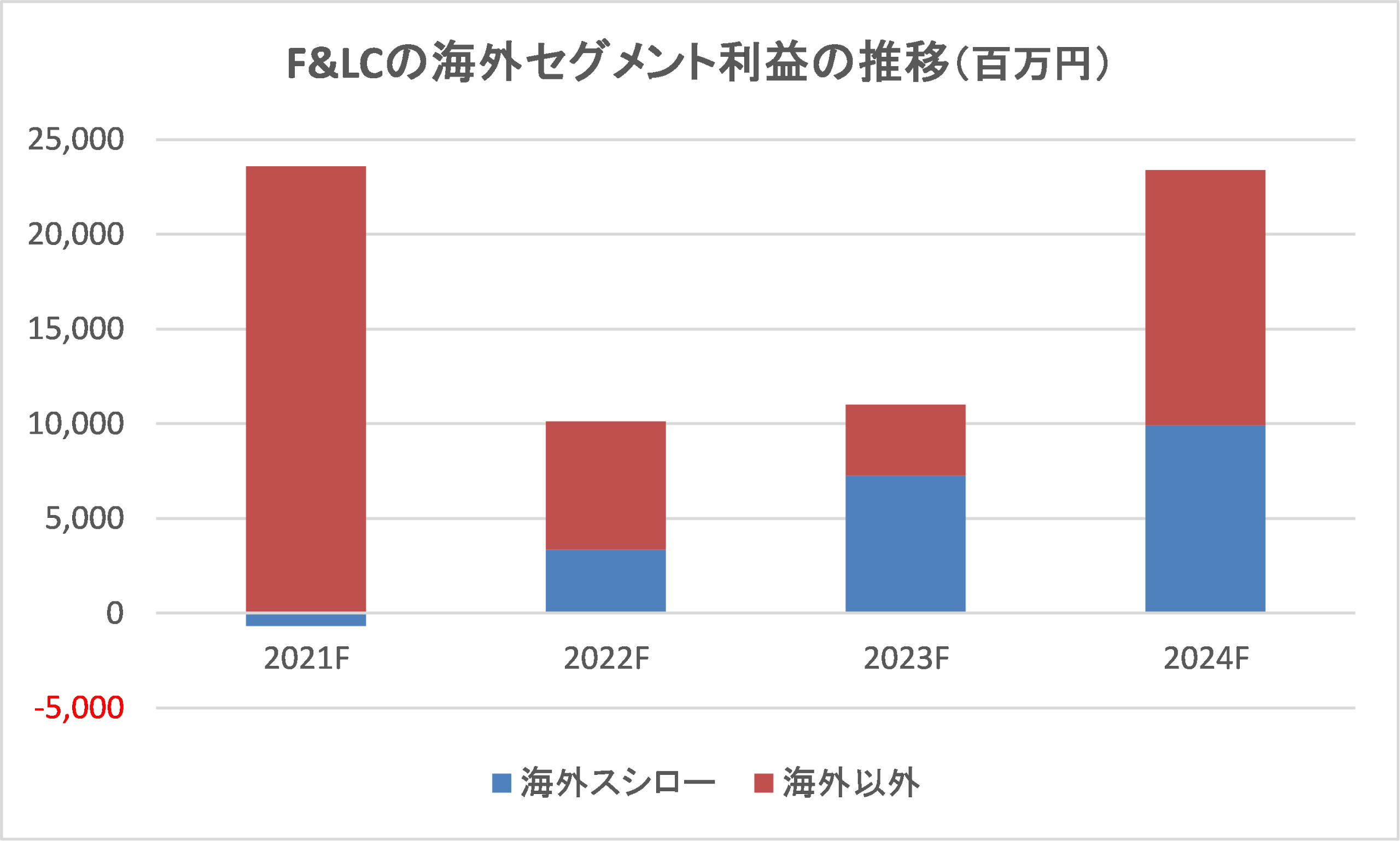 それに対して、F&LCでは進出後わずか数年で100億円の利益を上げるほどのスピードである。図はF&LCのセグメント利益を海外とそれ以外に分けたものである。当然、それ以外の大半は国内スシロー事業であるが、その他、京樽や居酒屋なども含んでいる。同社が海外進出を本格化したのはここ4-5年であるが、すでに100億円の営業利益を達成している。