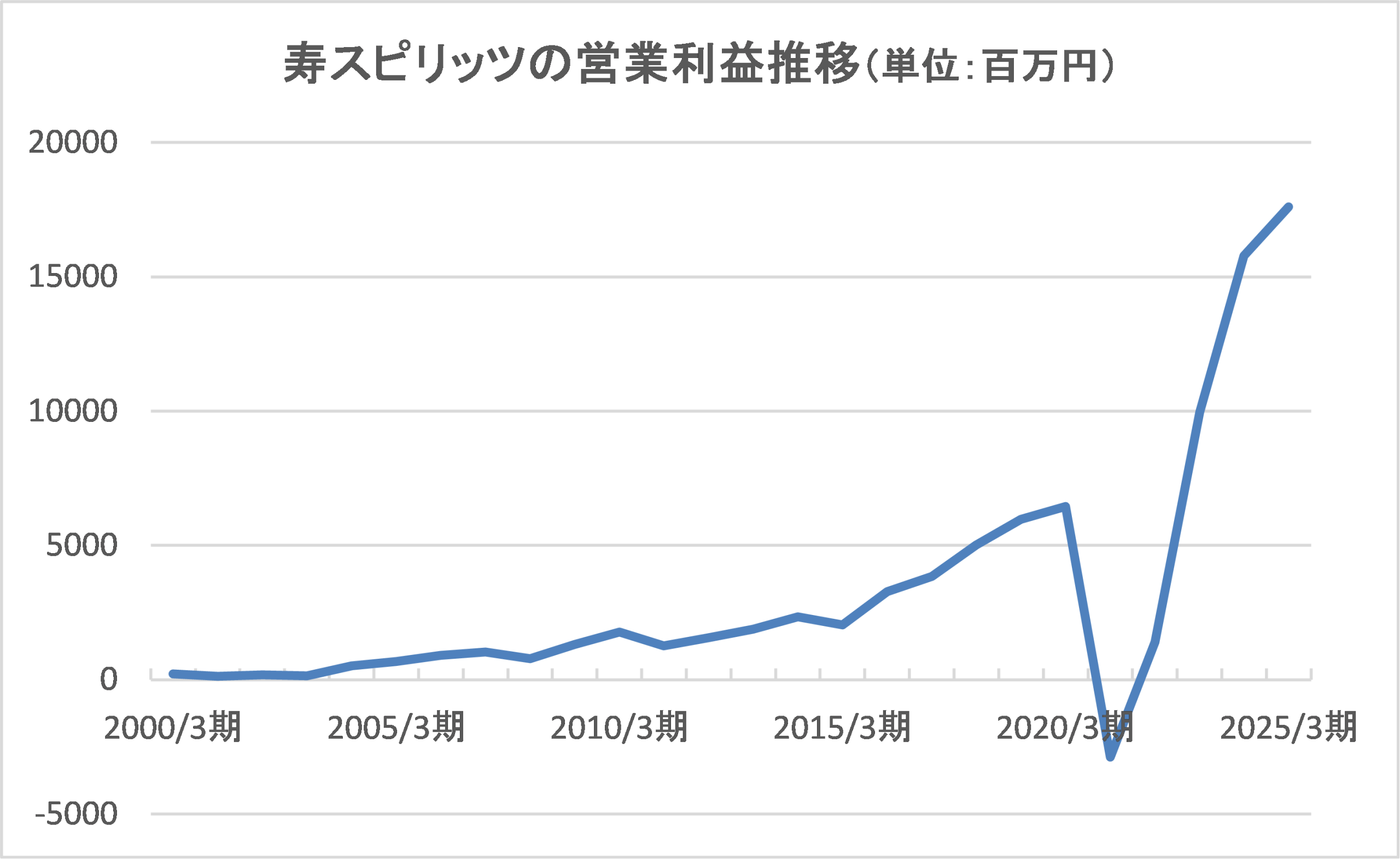 寿スピリッツは日本のお土産ビジネスでこの20年間に突出して成長し、今やお土産市場のガリバーとなった企業である。特にこの20年ほどの同社の成長には目を見張るものがあり、売上高は6.2倍、営業利益はなんと26.4倍となって、2025年3期期の営業利益は176億円に達する。しかも、この間にお土産市場に壊滅的な打撃を与えたコロナが挟まっているにもかかわらずである。むしろ、同社はコロナで他社が壊滅的な痛手を被る中で、同社も当然、壊滅的な痛手を受け、一時は赤字に落ち込んだが、むしろ、積極的な拡大策を取ることで、コロナの終焉とともに、他の追随を許さぬ超V字型の成長を成し遂げ、わずか数年でコロナ前の過去最高益の3倍もの利益をたたき出したのである。