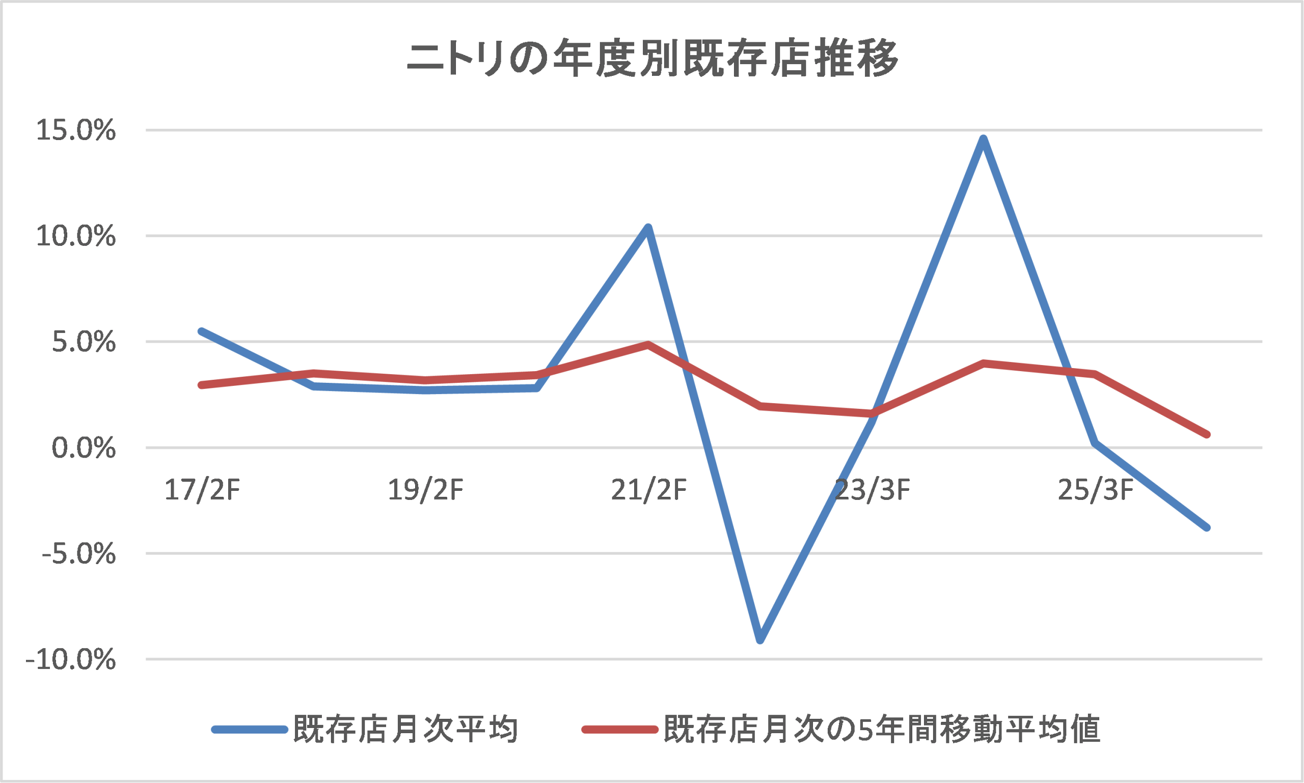 図はニトリホールディングスのニトリの国内事業の年度ごとの既存店売上高前期比推移の10年分である(青の実線)。また、赤の実線はその5年移動平均線を示している。このうち、2017/2期から2023/3期まで9期間の平均値は3.5%増と安定的な成長を遂げてきた。しかし、5年移動平均線を見ると2026/3期には0.6%増とこれまでになかったほど低水準となっている。なお、同社は2023/3期に決算期を2月から3月に変更した。また、2026/3期の数値は2月まで11カ月間の平均を用いている。