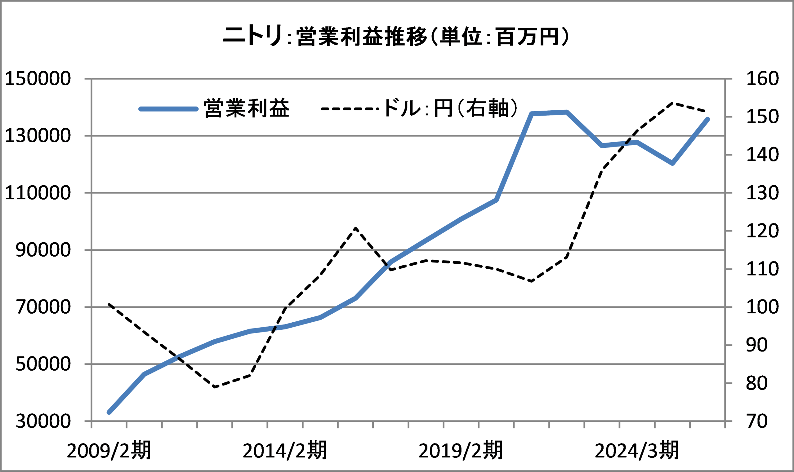 一つには上で述べた既存店の過去ないほどの低迷がある。そして、もう一点が円安である。同社は製品の90%ほどを輸入に頼っており、この間に為替が1ドル100円から150円と大幅な円安となったことが足を引っ張った。もっとも、過去にもアベノミクスによって、2011年に80円ほどであった対ドルの為替が2015年には122円まで大幅な円安となったことがある。しかし、この時には売上増で吸収し、この間の営業利益は26%増となっている。