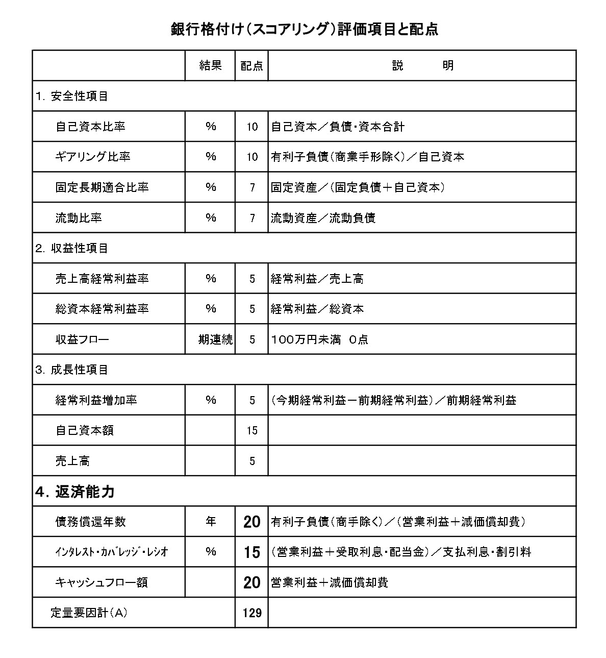配点表のなかでもウェイトの大きい項目が、「4.返済能力」です。お金を貸す銀行からすれば、返す力が大きいかどうかが一番大切なので、配点ウェイトが大きくなるのは当然なのです。全部で129点のうち、返済能力の配点が55点です。全体の43%です。