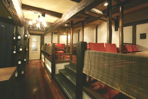 京都の町屋に見られる古民家風の内装に、ラテン風の情熱の赤色の家具を配置
