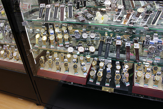 時計は、文字盤が大きく、ゴールドが主体。「肌の色に合うからかゴールドを好む人が多い。