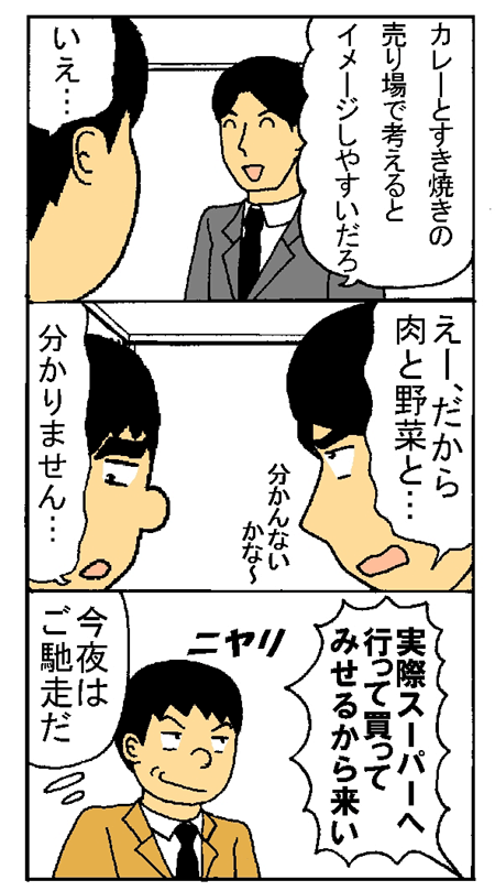 これが商品別の売り場ですと、カレーコーナーとすき焼きコーナーがあって、それぞれのコーナー内に必要な専門の材料が揃っているという感じです。この場合はあっという間に買い物が済むことになるでしょう。