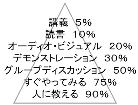 それでは、先回も出したラーニングピラミッドの図を再び載せます。この図は、「人は何によって育つか」を示したものです。