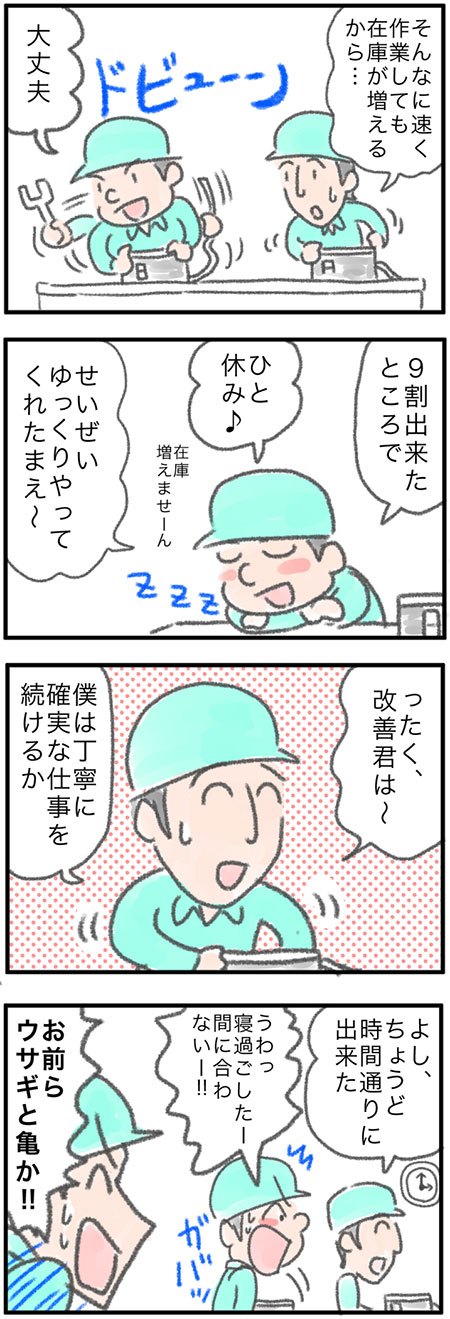 今回のテーマは、「早くつくり過ぎ」を防止するための行動指針です。そして、不思議に思われるかもしれませんが、速くつくるより、ゆっくりつくる方が生産性は良くなるのです。