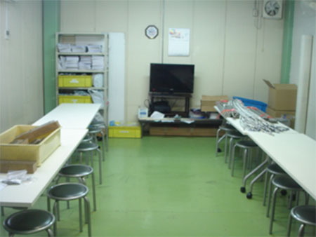 例えば、下の写真は改善前の食堂です。食堂なのに部品棚があるし、作業もするのでテーブルの上に部品も置いてあり、とても食堂には見えません。