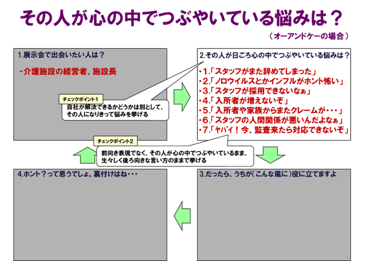それと、ここでもうひとつポイントがあります。それは、自社が解決できない悩みにも触れる、ということです。出展コンセプト検討シートの右上:「その人が心の中でつぶやいている悩みは?」の中には、自社で解決できないものもあるはずです。