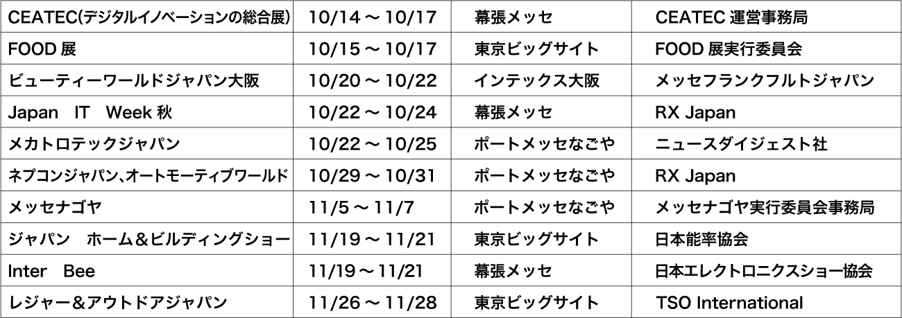 ※展示会・イベントの日程は変更することがあります。公式サイトから確認をお願いします。