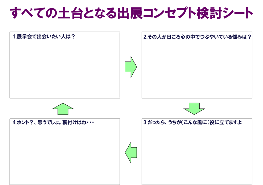 あなたはそう思ったかもしれません。でも、安心してください。出展コンセプト検討シートに基づいて考えていけばよいのです。
