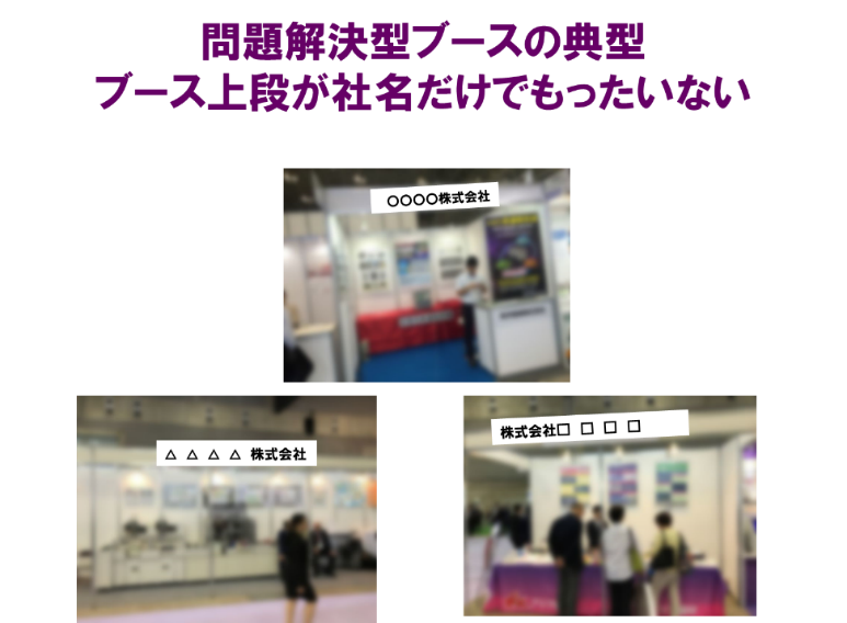 わずか3秒の間に、来場者に自社のブースに立ち寄らせないといけないのに、最も目立つパラペットに社名を書いているだけだと成果が出るはずがありません。あなたも自己紹介型ブースではなく、問題解決型ブースをつくるようにしてください。