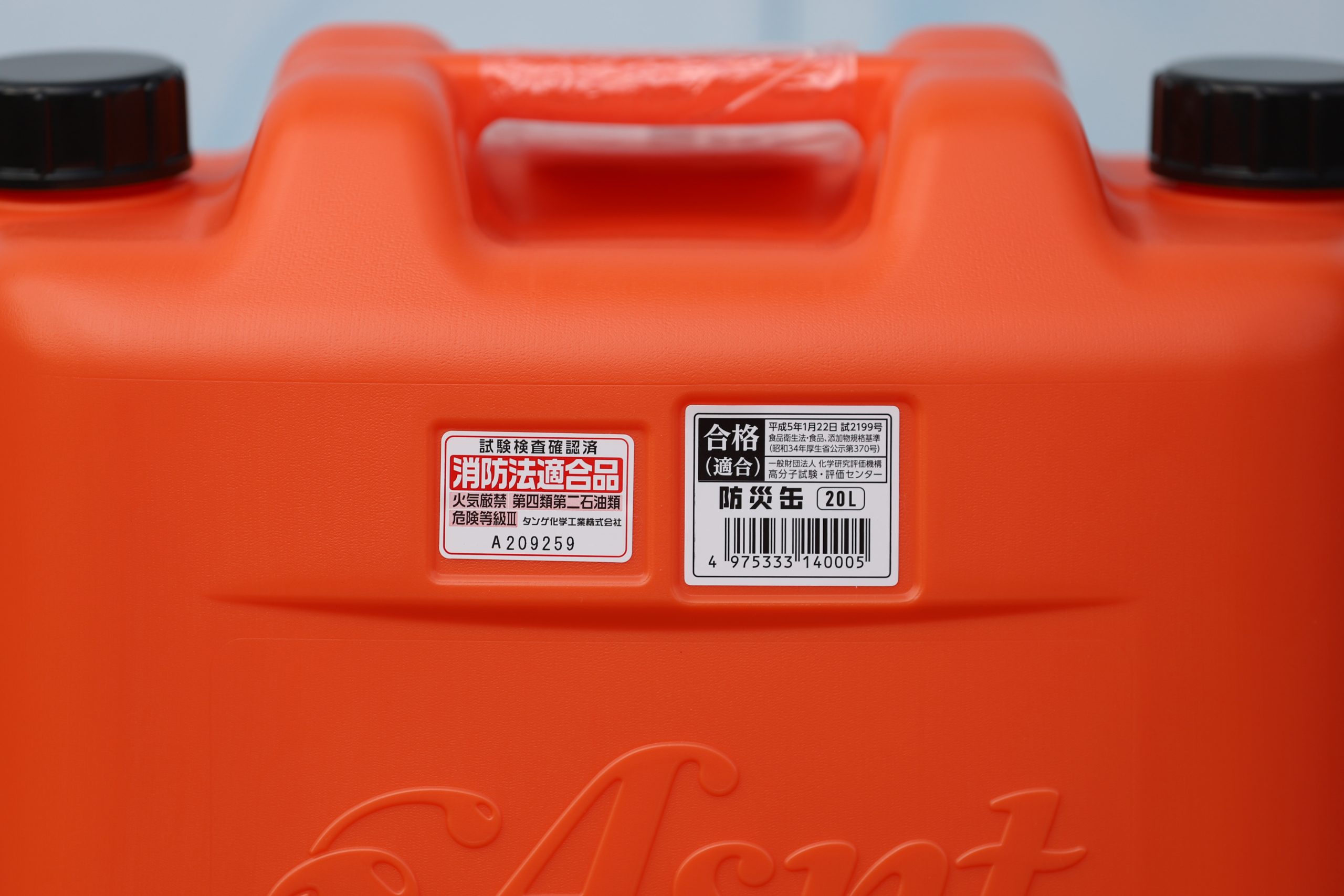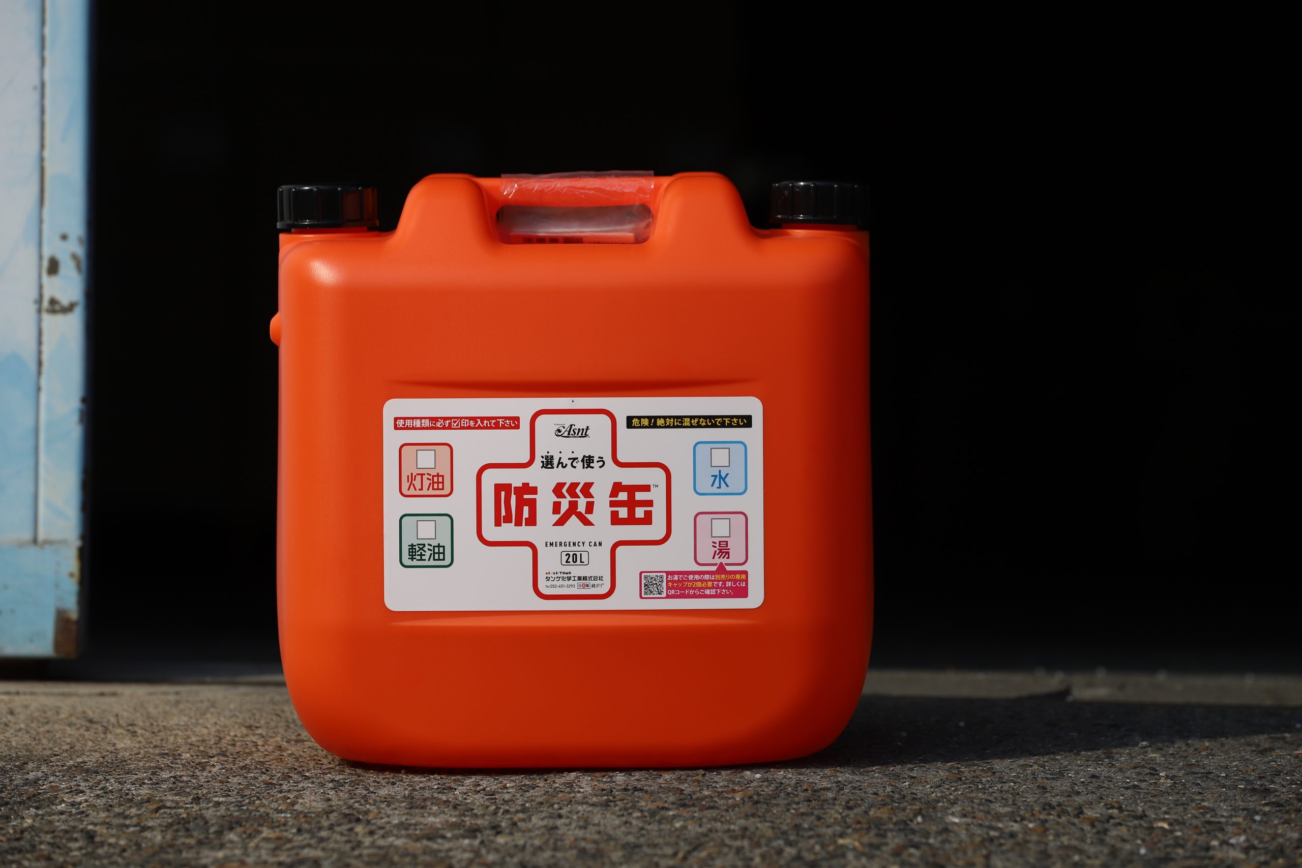 液体を運ぶためのポリタンクです。その名を「防災缶」といいます。業界ではポリタンクも「缶」と言い表すならわしがあって、この商品名になっているようです。