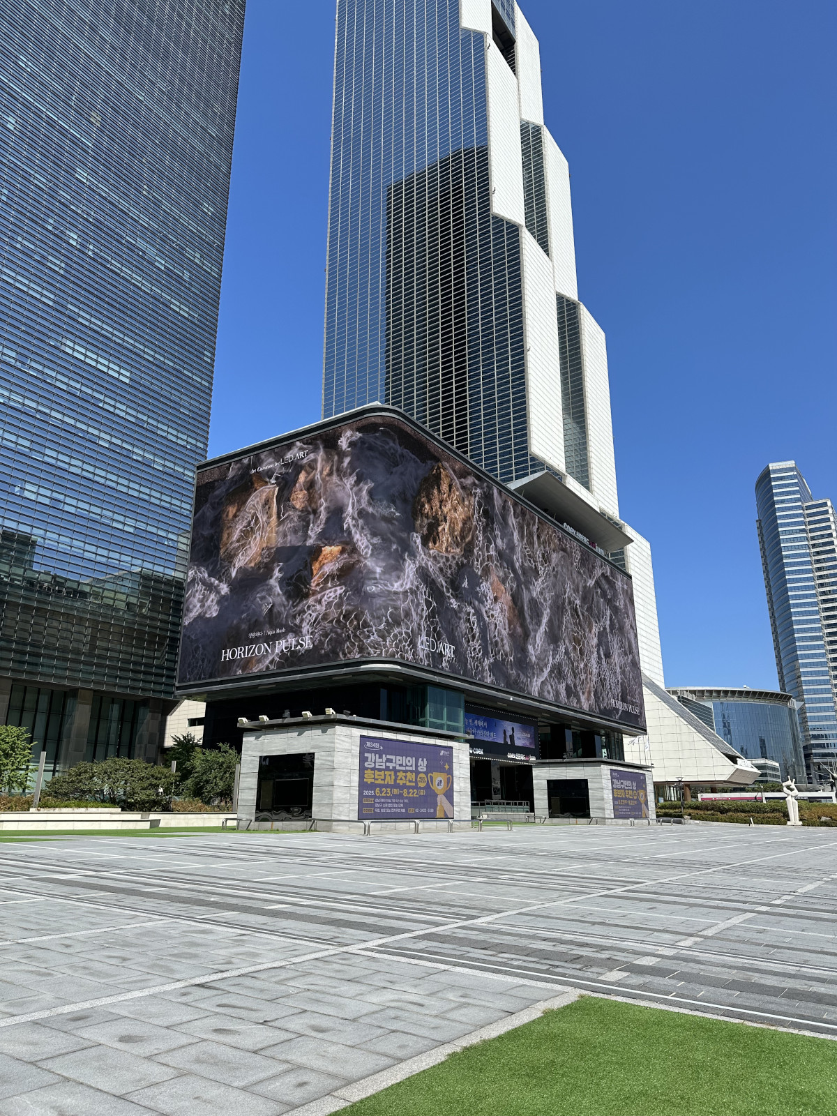 【写真】ソウルでも人気の繫華街「COEXモール」(江南)の南東角にある巨大LEDサイネージ。長方体の側面2面を用い、3D風に見える映像表現が世界的な話題に。屋外で直射日光を受けても鮮明なカラー映像を表示できる能力を備えています。韓国がLEDデジタルサイネージ先進国と感じる象徴的な例と言えます。