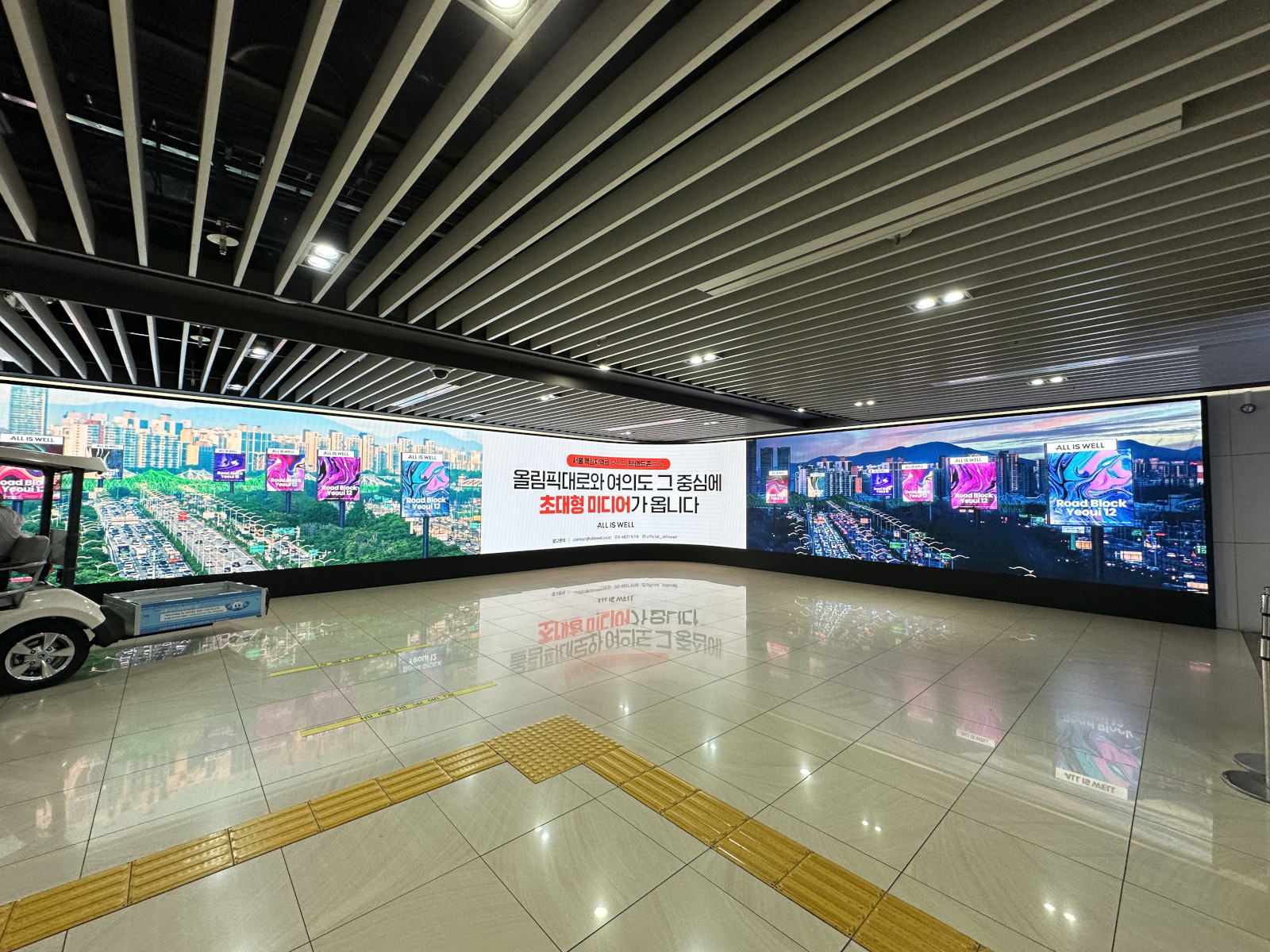 金浦空港内の例。壁全体がLEDサイネージで覆われ、2面が繋がるように長く大面積。比較的暗い地下空間で輝度が高いため、直視するのは辛い状況でした。