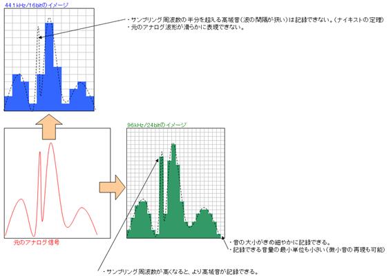 端的には、元の音の波形を、デジタルでもより忠実に記録や再生できるようになることで、音質が向上するのです。