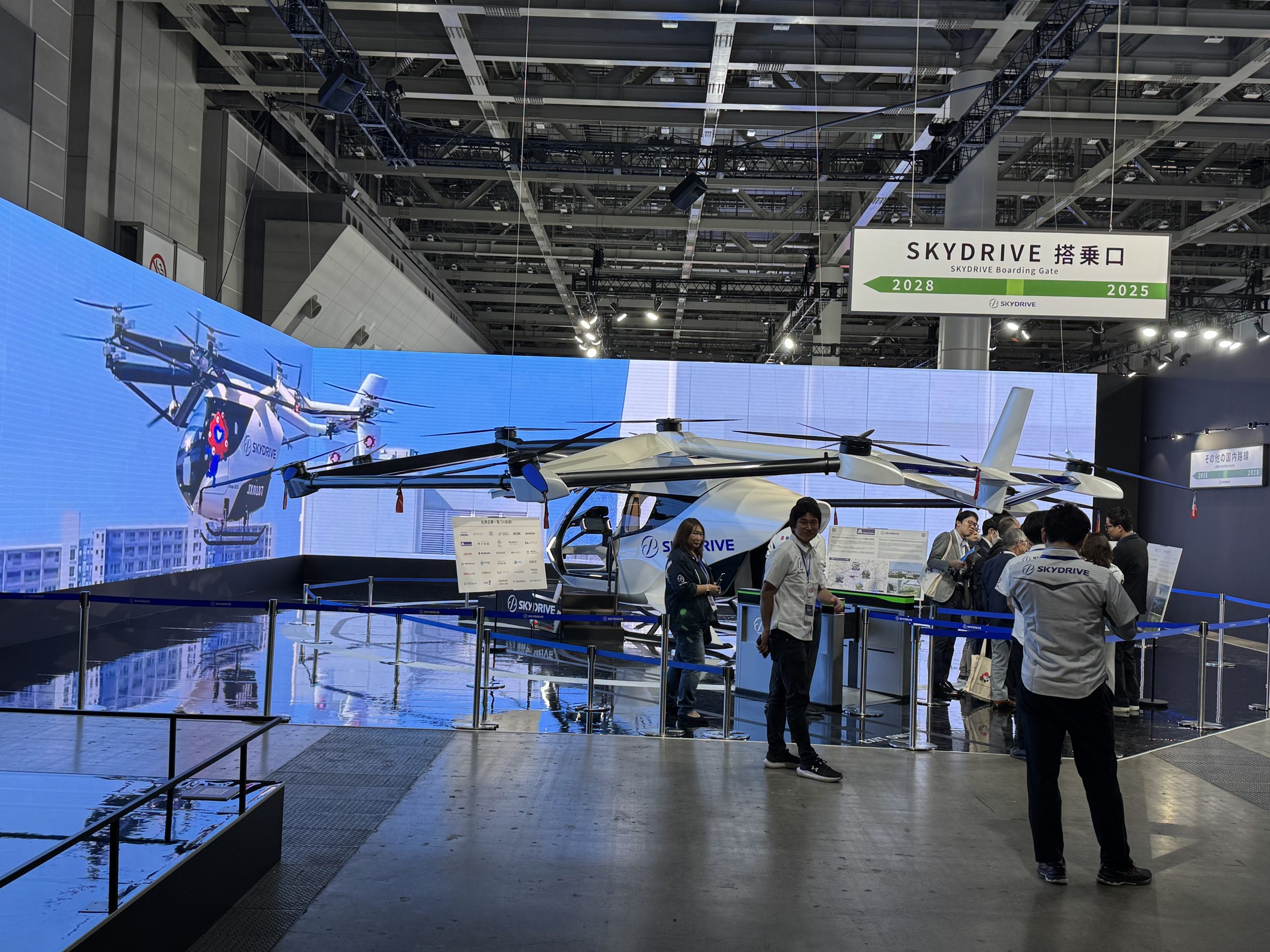 この特設空間に足を踏み入れてすぐの場所に展示されていたのは、愛知県豊田市のSkyDriveのブースです。実物大の空飛ぶクルマが目に飛び込んできます。