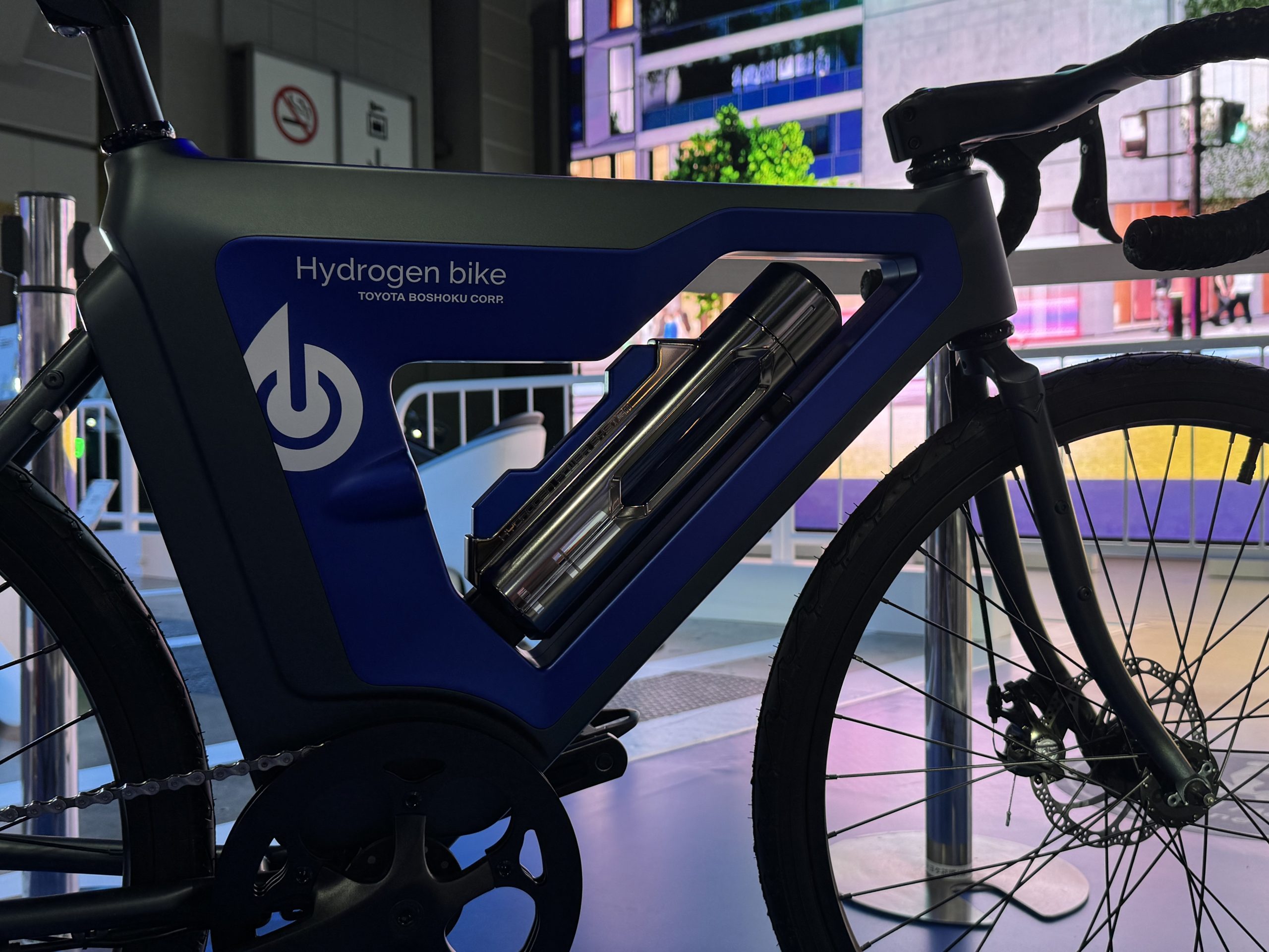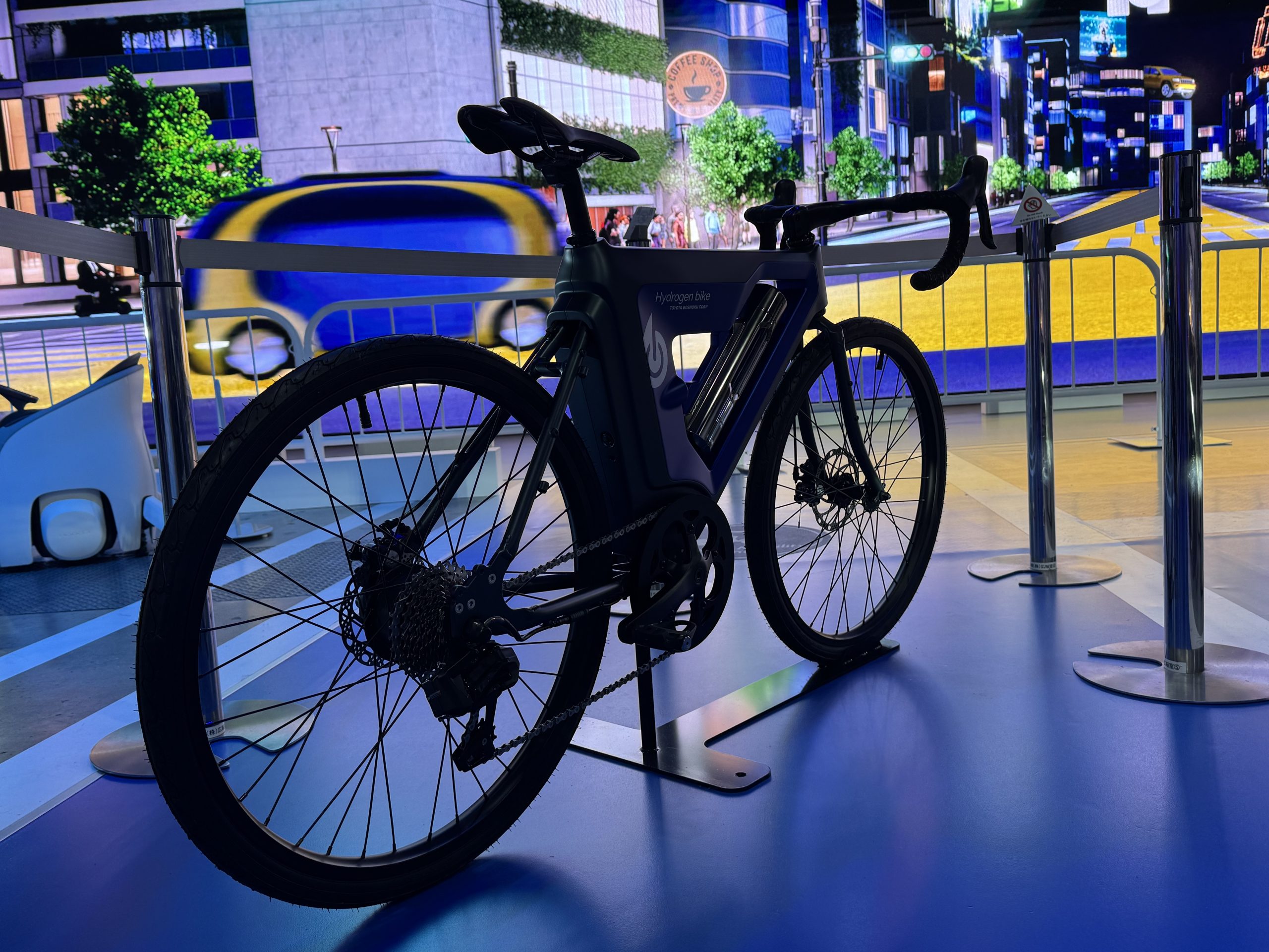 トヨタ紡績の担当者に尋ねたら、水素タンクを自転車に装着する形なのだといいます。どこにタンクがあるのかと思ったら、上の画像をご覧ください。斜めになっているフレームについている、細い水筒状のもの(渋い銀色に光っている筒)が水素タンクだそうです。水素タンクを両足のあいだに挟む格好なのかと、ちょっと不安にも感じますが、同社によると安全性には留意された構造とのことでした。
