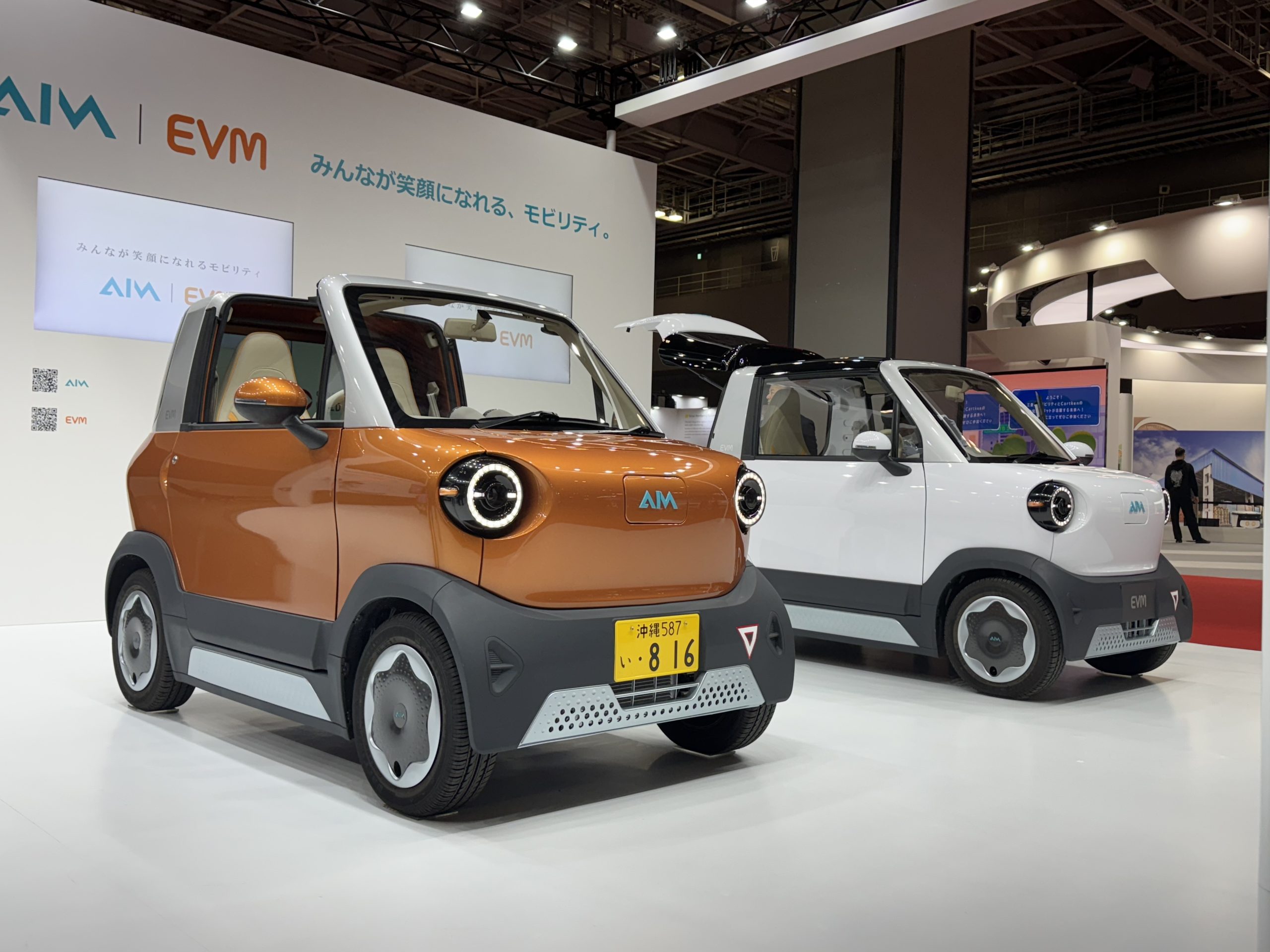 数あるメーカーによるブースのなかで私が注目したのは、名古屋市のエイムが開発した小型モビリティ「AIM EVM」です。一昨年も出展していましたが、今回は量産仕様車が並んでいます。税別190万円からで、すでに法人向けには予約受付をスタート、来春には一般ユーザーからも受け付ける予定といいます。
