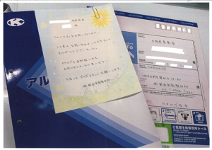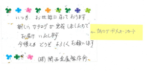 経理部のスタッフが手書きしたメッセージつきのカタログには温かみを感じたとの反応があったようです。