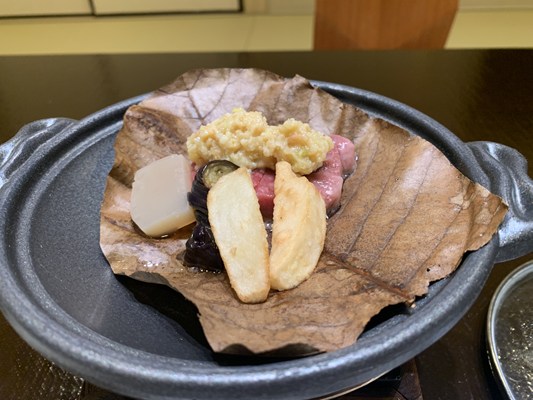 和牛の料理は、提供するだけで加点する料理です。高単価に誘導するには欠かせません。種田和義が西京味噌、薄口醤油、味醂で作ったオリジナルの朴葉味噌が美味しい。お味噌がおいしいので、寿司のシャリくらいのちょいお米があっても良いのかもしれません。