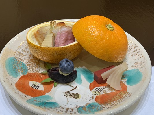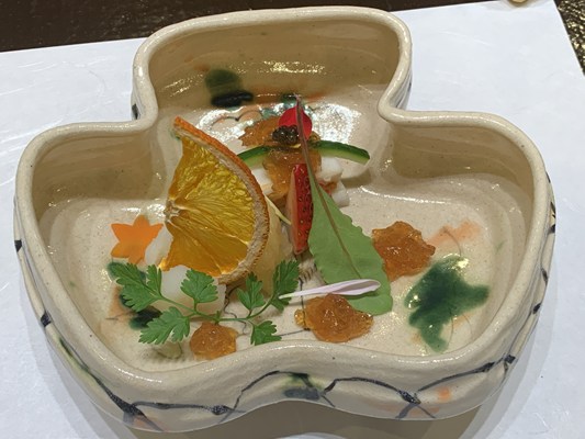 酢漬けの蕪、あん肝(+10)、豆乳寒天、胡瓜、橙ポン酢とみかん酢のジュレ、栃おとめ、りんごの天ぷらと乾燥したオレンジが添えてあります。