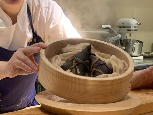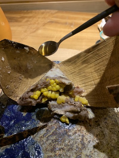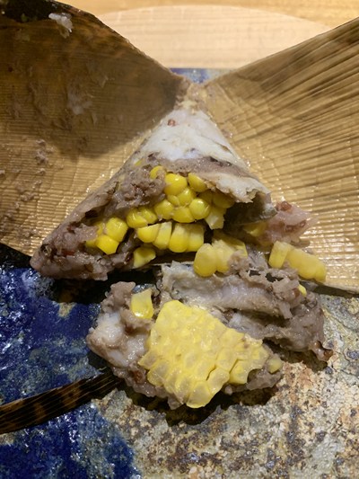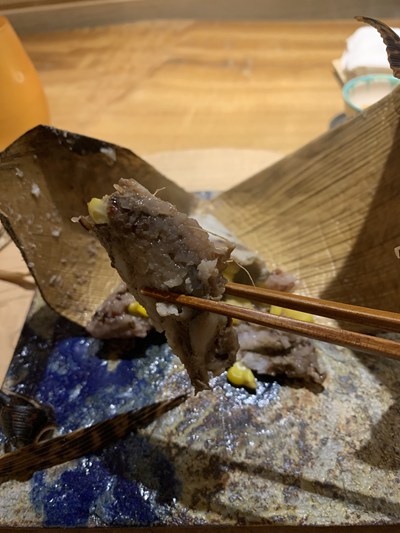炭火で焼いて、身、骨、肝にわけて骨は出汁をとり穀物を炊きます。肝はペーストに。とうもろこし、赤米黒米もち麦、鮎身、肝、をまとめて竹皮で包み蒸しあげています。