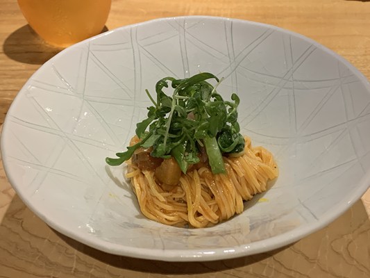 本田シェフ自家栽培小麦を使った麺料理は夏野菜のトマトの冷製パスタ。