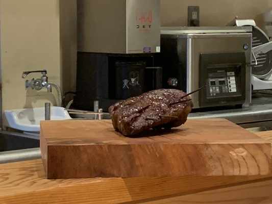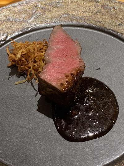 信行牛と言われる井信行さんのあか牛。本日は、30.3ヶ月齢の雌、388kの個体のあか牛です。ソースは熊本の赤酒、お肉の出汁を煮詰め、阿蘇の名産、高菜の種のマスタードを加えています。フライドオニオンを添えて肉味の幅を広げました。歯応えと弾力を兼ね備えていて美味しいですね。高菜のマスタードの辛さと赤酒の甘さがよいなかなかおいしいソースで、これも良いです。