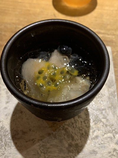 西村果樹園の桃、黒糖密、地元のパッションフルーツ、本田シェフが育てたブルーベリーを白ワインのジュレで。やさしい甘さで美味しいですね。
