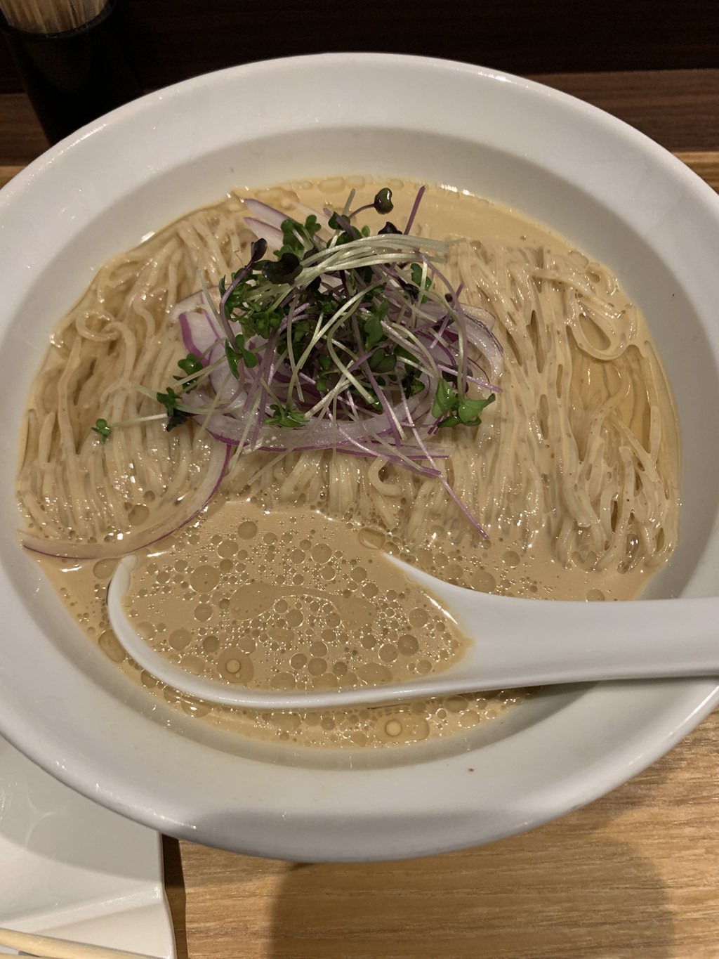 牡蠣は三陸牡蠣と境港の牡蠣だそうです。煮干しと溶かし込んだ牡蠣のスープ。上にのっている油が良いのでしょう。牡蠣の油ではないと思いますが、クリーミーで牡蠣の香りが広がり、こ・れ・は・う・ま・い!!ただし、明日朝の血圧上昇間違いなし。おそらく150超え。