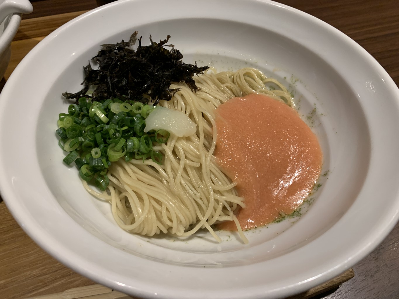 それで、私の前の女子1名×2が券売機で麺を注文して、私たち、加点要素調査部の順番になりました。なんと、限定20食の「冷や牡蠣」が奇跡的にまだあるので、こちらと、あと替え玉、明太子の和え麺にします。「丿貫 福富町本店」と似てますね。守破離作戦か。