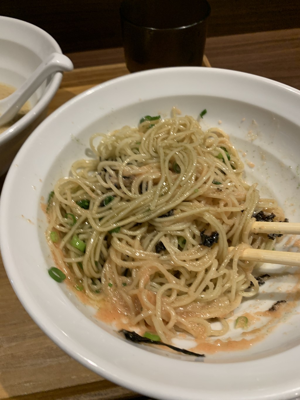 替え玉の和え麺を催促します。本日は明太ジェノベーゼだそうです。
