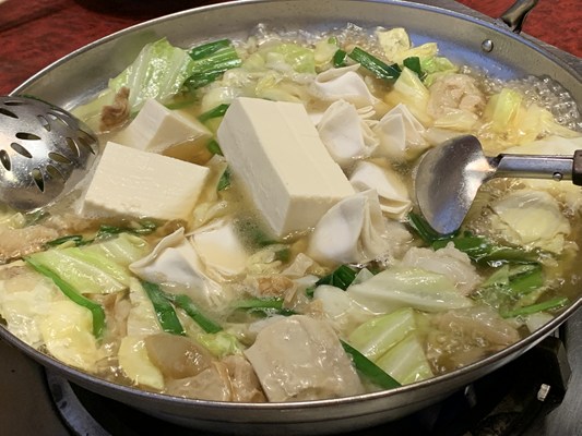 続いて、「大阪難波 かすもつ鍋」が到着です。「かすうどん」で有名な大阪名物の「かす」がたくさん入っています。今日は関守社長のおすすめで水餃子と豆腐をトッピングしています。また、煮えるのを待ちましょう。