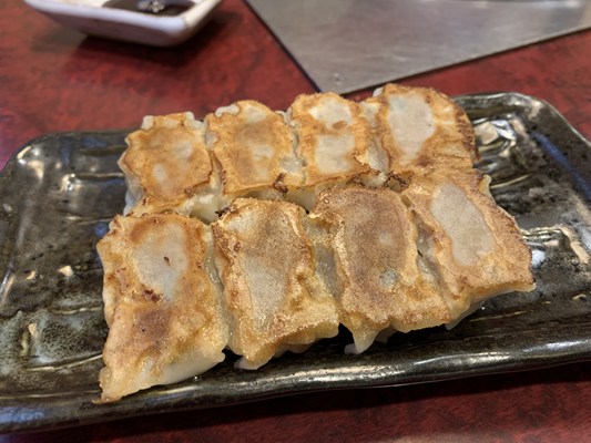 一口餃子が到着しました。メニューは博多餃子と書いてありますが、「旭軒 駅前本店」とはまた形も味も違いますね。あちらはジャンキーな味わいでしたが、上品な味わいで皮が意外ともちっとしておいしいです。