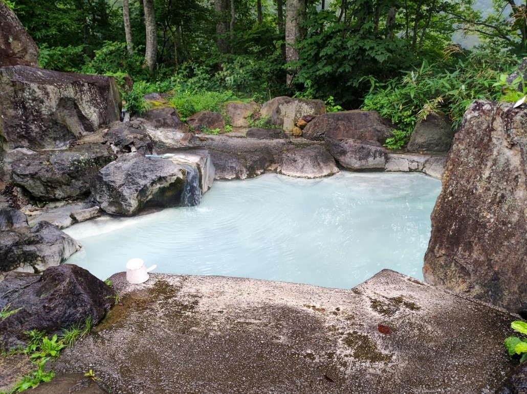 とくに「河原の湯」は文字どおり渓流沿いにあり、野性的なロケーションが感動的だ。緑に囲まれた湯船は、10人以上が一緒に入浴できる岩風呂で、ミルクのような白濁の湯が輝きを放っている。硫黄泉特有の香ばしい匂いも強く、パンチのきいた見た目だが、実際に入浴すると、泉温は40℃弱で、肌触りもマイルド。思わず長湯したくなる泉質である。