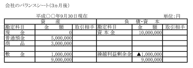 会社のバランスシートは、少し悪化しています。家賃等の経費3か月分が赤字になり、繰越利益剰余金がマイナス100万円になっています。