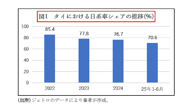 図1に示すように、ここ数年、タイ自動車市場における日本車のシェアが急落している。2022年に85.2%を占める日本車の市場シェアが、23年に77.8%、24年76.7%、25年1~6月70.6%へと、僅か3年余りで15ポイントも減少した。