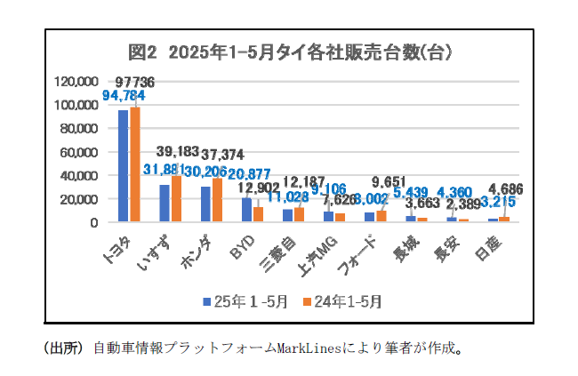 図2は日米中自動車メーカー2025年1~5月タイでの販売実績を示すグラフだが、前年同期に比較すれば、中国車の凄まじい勢いが伺える。