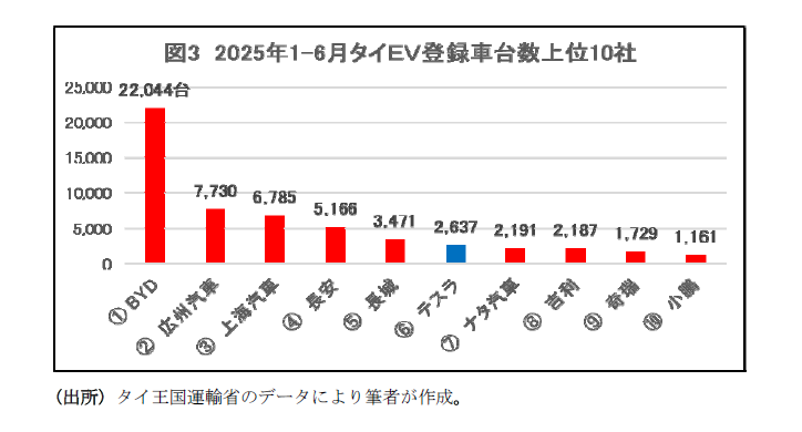 図3は今年1~6月タイでのEV登録車台数のデータだが、上位10社に中国勢が9社を占め、ベスト5を独占している。米テスラが6位。残念ながら、上位10社に日本勢の姿が見えなかった。
