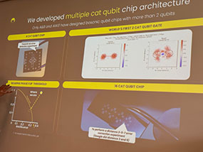 6月のフランス視察ツアーで訪問した「Alice&Bob」は、現在の量子コンピュータ開発で注目されている「誤り訂正」という分野で有効とされている「キャット(猫)量子ビット」という方式に特化した量子コンピュータのチップを作っているベンチャー企業で、Googleの方式の1/10の量子ビット数を実現している。